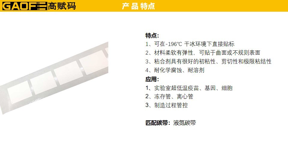 標簽貼試到承貼物后,在-70度的環境中長期使用,而標簽不易脫落,便于冷庫物品的管理與查詢。