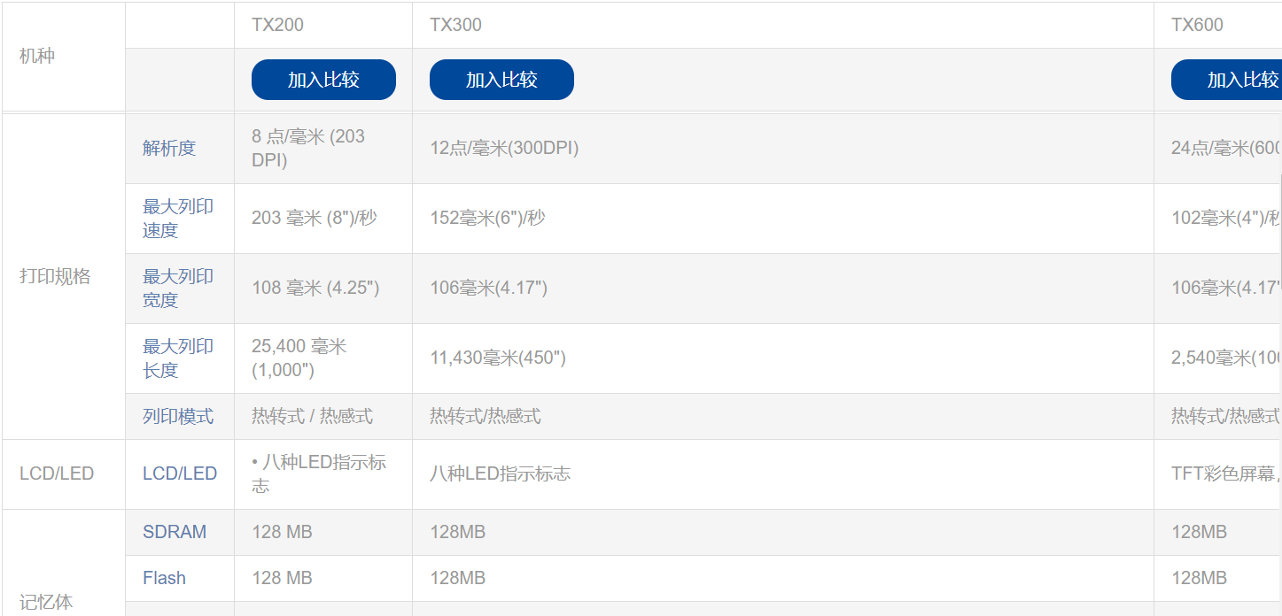 TX200系列四吋寬桌上型熱感/熱轉式條碼標簽列印機,依據解析度不同包含三款機種,支援更多應用,從4x6貨運標簽、高解析度產品標示標簽、到精致的珠寶電子產品標簽等。TX200系列包含203 dpi,最高列印速度達每秒8英吋的TX200、300 dpi最高列印速度達每秒6英吋的TX300與600 dpi的TX600適合于二維條碼、圖示、小字或其他超高解析列印需求之圖形標簽。TX200系列將在2015年Q1于全球販售。