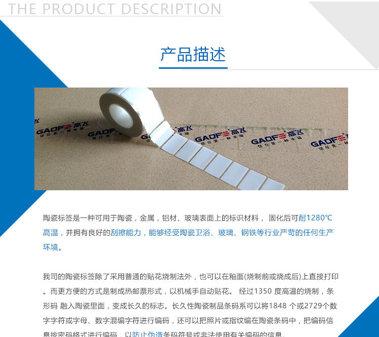 陶瓷標簽可以用于金屬,陶瓷,玻璃產品的識別和條碼管理。固化后標簽和打印圖像能夠耐1280℃高溫和優異的耐摩擦性能。