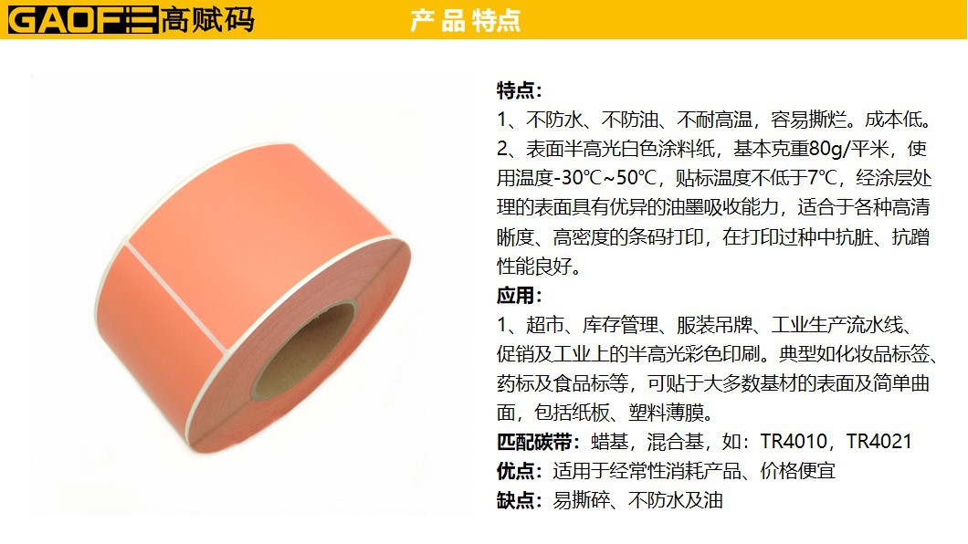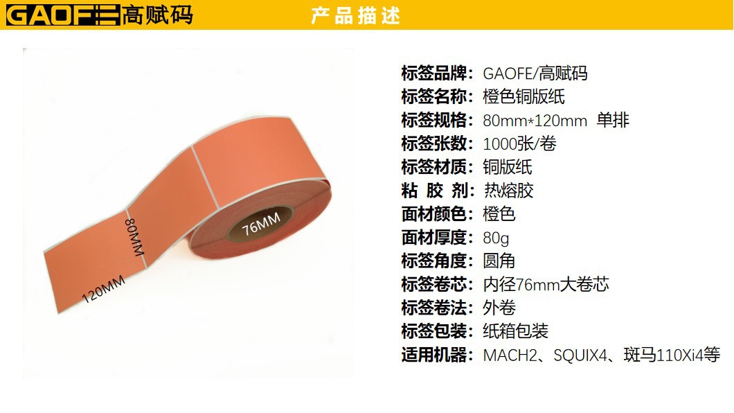 不干膠標簽 銅版紙標簽貼紙 橙色標簽 80mm*120mm 1000張 高賦碼