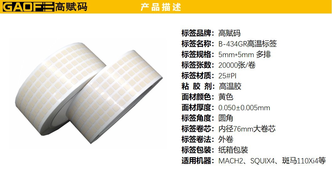 高溫標簽 B-434GY 黃色高溫PI 5mm*5mm 電子行業(yè)-高賦碼