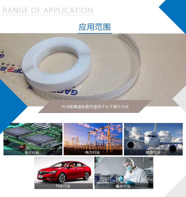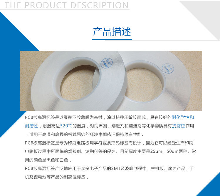 PCB板高溫標簽聚酰亞胺薄膜為基材,涂以特種壓敏膠而成,具有較好的耐化學性和耐磨性,耐溫范圍200℃~600℃,對助焊劑、熔融劑和清潔劑等化學物質具有抗腐蝕作用,使用于高溫和磨損的極端惡劣的環境中能保持原本性能。它是專為印刷電路板用字符或條形碼標簽而設計,因為它可以經受生產印刷電路板過程中所面臨的焊接劑、熔融劑等的侵蝕。目前厚度主要是25um、50um兩種。常用的顏色是黑色和白色 。PCB板高溫標簽廣泛地應用于眾多電子產品的SMT及波峰制程中、主機板、腐蝕產品、手機及鋰電池等產品的PCB板高溫標簽。