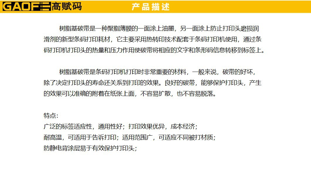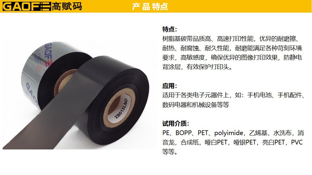 洗水嘜碳帶品質(zhì)高、高速打印性能,優(yōu)異的耐磨擦、耐熱、耐腐蝕、耐久性能,耐磨能滿足各種苛刻環(huán)境要求,高敏感度,確保優(yōu)異的圖像打印效果,防靜電背涂層,有效保護(hù)打印頭。
