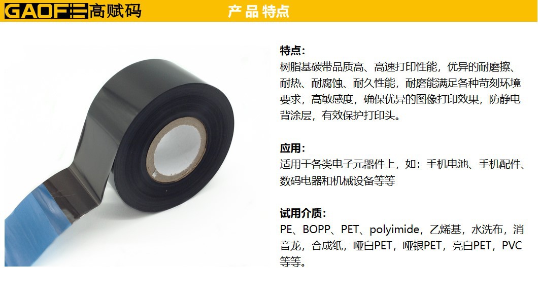 樹(shù)脂基碳帶品質(zhì)高、高速打印性能,優(yōu)異的耐磨擦、耐熱、耐腐蝕、耐久性能,耐磨能滿(mǎn)足各種苛刻環(huán)境要求,高敏感度,確保優(yōu)異的圖像打印效果,防靜電背涂層,有效保護(hù)打印頭。