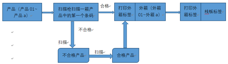 (5)如特殊情況,無需等待外箱標簽數量為b時,可強制打印棧板標簽,系統記錄。——例如上午生產外箱B1(打印),下午生產外箱B2,要求可以合并棧板(B1+B2)后重新覆蓋打印標簽,系統記錄