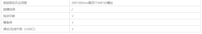 支持碰撞檢測、拖動示教、硬急停、調試/在線升級(USB口)